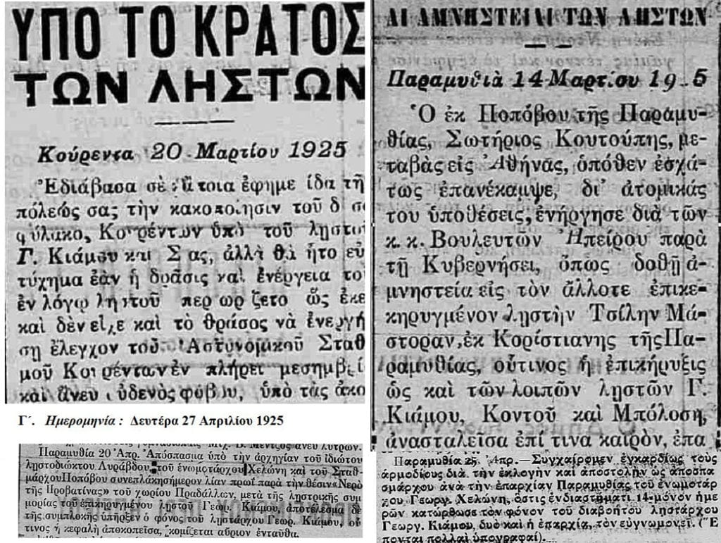 Ο εκ Ποπόβου της Παραμυθίας, Σωτήριος Κουτούπης, μεταβάς εις Αθήνας, εσχάτως επανέκαμψε, δι’ ατομικάς του υποθέσεις, ενήργησε δια των κ.κ. Βουλευτών Ηπείρου παρά τη Κυβερνήσει, όπως δοθεί αμνηστεία εις τον άλλοτε επικηρυγμένον ληστήν Τσίλην Μάστραν, εκ Κορίστιανης της Παραμυθίας, ούτινος η επικήρυξις ως και των λοιπών ληστών Γ. Κιάμου, Κοντού και Μπόλοση, ανασταλείσα επί τινα καιρόν, επανήλθε εσχάτως εν ισχύι δια πάντας τους λοιπούς, πλην του ρηθέντος Τσίλη Μάστορα, επι τω λόγω ότι δήθεν ούτος μόνος συνετέλεσεν εις την εξόντωσιν της συμμορίας Αζίζ Λιούλιε και Μπέκιου Κιαμήλ Χόντζα (αδελφού του γνωστού ληστού Νταούτ Χόντζα, διαμένοντος ήδη εν Αλβανία). Ερωτώμεν ήδη, διατί οι κ.κ. Βουλευταί Ηπείρου εζήτησαν την αμνηστείαν μόνον του Τσίλη Μάστορα και ουχί και των λοιπών Γ. Κιάμου, Κοντού και Μπόλοση; Μήπως νομίζουν ότι μόνον ούτος συνετέλεσεν εις την εξόντωση της συμμορίας Αζίζ Λιούλιε, κτλ. Ας γνωρίσουν, ως άλλως είναι παγκοίνως γνωστόν, ότι εις τον φόνον και την εξόντωσιν της συμμορίας Αζίζ Λιούλιε συνετέλεσεν ου μόνον ο Τσίλης Μάστορας, αλλά και οι ανωτέρω Γ. Κιάμος, Κοντός και Μπόλοσης, προσενεγκόντες επίσης κατά τας τελευταίας εκλογάς και το Δημοψήφισμα, ουχί μικροτέρας του Τσίλη Μάστορα δια την ανάδειξιν τούτων ως Βουλευτών. (1) Καθήκον όθεν είχον και έχουσιν οι κ.κ. Βουλευταί της Ηπείρου να ενεργήσουν όπως δοθεί αμνηστεία ουχί μονομερώς εις τον Τσίλη Μάστοραν, αλλά και εις πάντας τους ανωτέρω, τοσούτω δε μάλλον επιβάλλετο η ενέργεια αύτη, δια τον Γ. Κιάμον, καθόσον πλην της συμμετοχής του εις την εξόντωσιν της συμμορίας του Αζίζ Λιούλιε, κατε-δίωξεν ούτος συστηματικώς και τελεσφόρως και την συμμορία του επικεκηρυγμένου και διαβοήτου ληστού Κώστα Νάση, ήτις αδυνατούσα πλέον να διατηρηθεί εις την περιφέρειαν Ποπόβου και εν γένει ολοκλήρου της Παραμυθίας, ηναγκάσθνη να εύρη κρησφύγετο εις την περιφέρειαν Πάργας (ένθα υπήρχεν με το ποίμνιόν του ο αρχιποιμήν Γιάννης Σακαρέλης εκ Ποπόβου), όπως επίσης δεν αφήκε ταύτην ήσυχον ο ρηθείς Γ. Κιάμος εκ Πράδαλας, αλλά δις μετέβη και εκεί προς καταδίωξιν ταύτης, εξ ου πανταχόθεν πιεζόμενοι οι οπαδοί του ρηθέντος Κώστα Νάση, ηναγάκσθησαν καθ’ ύπνους να δολοφονήσωσι τον αρχηγόν των Κ. Νάσην και ούτω και την βεβαίαν σύλληψιν ή εξοντωσην των υπό Γ. Κιάμου διέφυγον και μετ’ ελπίδων πολλών προσβλέ-πουσιν εις την χορήγησιν αμνηστείας δι’ αυτούς, εκτός και της αμοιβής. Τα δε της υπό του Γεωργίου Κιάμου καταδιώξεως της συμμορίας Κ. Νάση, είναι τόσον βεβαια και αληθή, ώστε ου μόνον εις την περιφέρειαν ολόκληρον της επαρχίας Παραμυθίας και Πάργας, αλλά και εις απάσας τας αρμοδίας Αρχάς τυγχάνουσι γνωστά και προ και μετά τόν φόνον του Κ. Νάση. Ορθόν όθεν, επαναλαμβάνουμεν και επιβεβλημένον είναι κατόπιν των ανωτέρω, όπως οι κ.κ. Βουλευταί της Ηπείρου ενεργήσωσιν ίνα και εις τους ρηθέντας Γ. Κιάμον, Κοντόν και Μπόλοσην δοθεί αμνηστεία, αφού πρώτον ανασταλεί η επικήρυξις των, ως του Τσίλη Μάστορα ή άλλως διαταχθεί η σύντονος και αποτελεσματική καταδίωξις και εξόντωσις απάντων των ληστών, τούτων άνευ εξαιρέσως τινός προς ησυχίαν του τόπου …. »