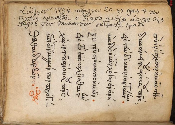 Αρβανίτικη γραφή με ελληνικά γράμματα στο περιθώριο:”εμπάϋτε μεντ γκουστ μουαγ ελερε παρε ντιάλε δημητριος βαρηζ Γιανο Σουλο πη ρεχατ(δισανάγνωστο) εν ετοι 775″                                                                                                                         “Κάνω θύμηση Αύγουστος μήνας πρώτου παιδιού απογόνου Γιάννη Σούλου “αγαλιάζουμε” (είμαστε άνετοι) εν έτοι 1775″.