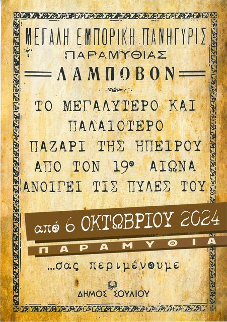 Ο δήμος Σουλίου σας προσκαλεί στο Λάμποβο στην παλαιότερη και μεγαλύτερη  ετήσια εμποροπανήγυρη της Ηπείρου, που θα διεξαχθεί στην Παραμυθιά  από 6 -13 Οκτωβρίου 2024.  Ο Λάμποβος αποτελεί θεσμό για την περιοχή μας, διατηρώντας μια παράδοση αιώνων και προσελκύει το ενδιαφέρον εκατοντάδων επισκεπτών και εμπόρων από όλη την Ελλάδα, με την πληρότητα να αγγίζει το 100%.