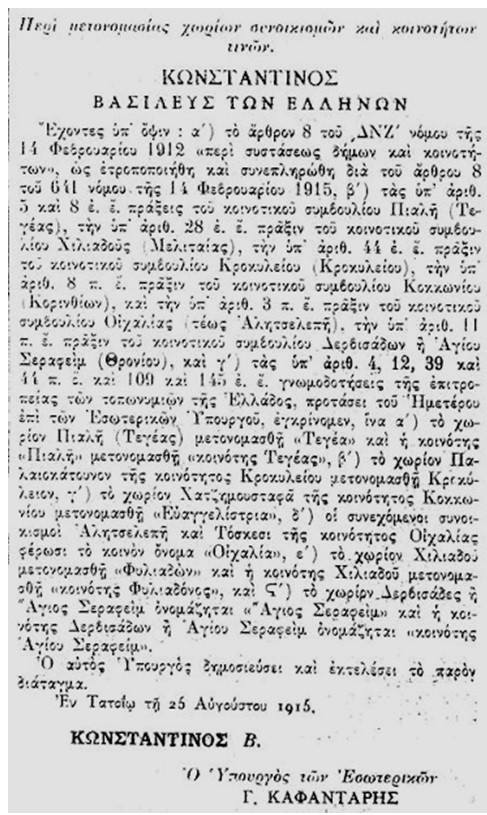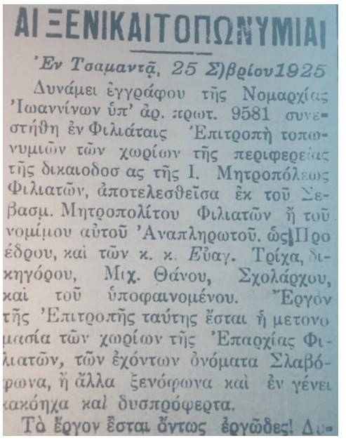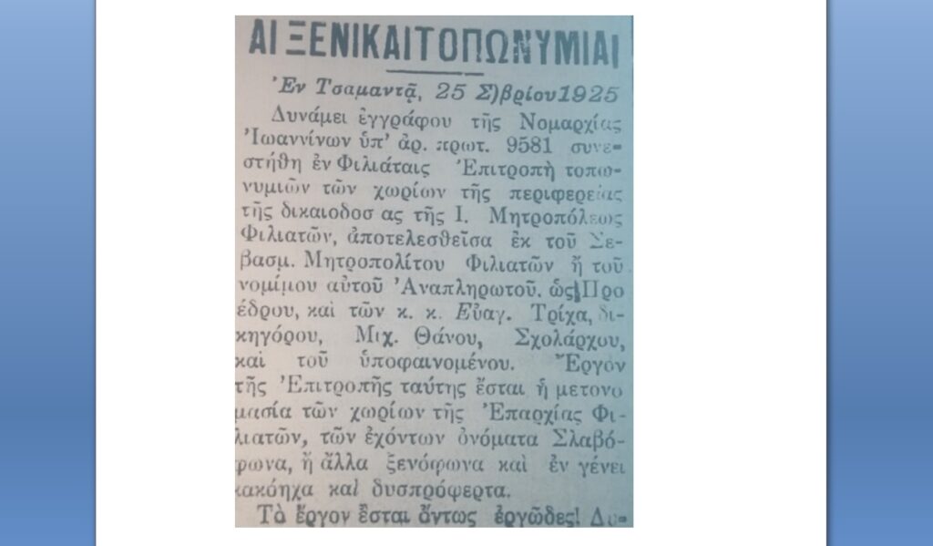 « Απαγορεύεται απολύτως η χρήσις των παλαιών ονομάτων υπό των δημοσίων αρχών ή οργάνων εν τη επισήμω αλληλογραφία αυτών, των συλλόγων, σωματείων, συνεταιρισμών κλπ. νομικών προσώπων εν τη αλληλογραφία αυτών. Η παράβασις της απαγορεύσεως ταύτης αποτελεί πταισματικήν παράβασιν τιμωρουμένην με πρόστιμον μέχρι 100 δραχμών ή με κράτησιν μέχρι 10 ημερών » ( Πηγή : ΦΕΚ Α΄. 281/1927)