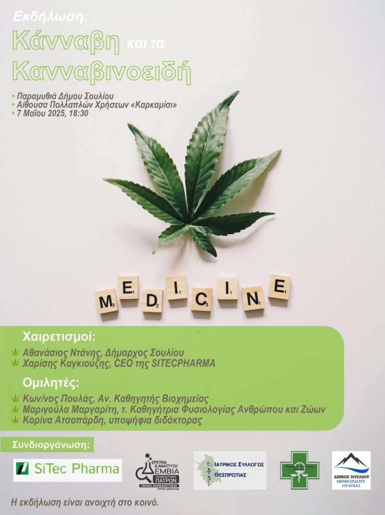 Τη διοργάνωση υπογράφουν η SITECPHARMA και το Εργαστήριο Μοριακής Βιολογίας και Ανοσολογίας του Τμήματος Φαρμακευτικής, Πανεπιστήμιο Πατρών, σε συνεργασία με τον Ιατρικό Σύλλογο Θεσπρωτίας, τον Φαρμακευτικό Σύλλογο Θεσπρωτίας και τον Δήμο Σουλίου. Η εκδήλωση φιλοδοξεί να φέρει στο προσκήνιο την επιστημονική γνώση γύρω από την κάνναβη και τα κανναβινοειδή, παρουσιάζοντας τις νεότερες ερευνητικές εξελίξεις και τις ιατρικές εφαρμογές τους.
