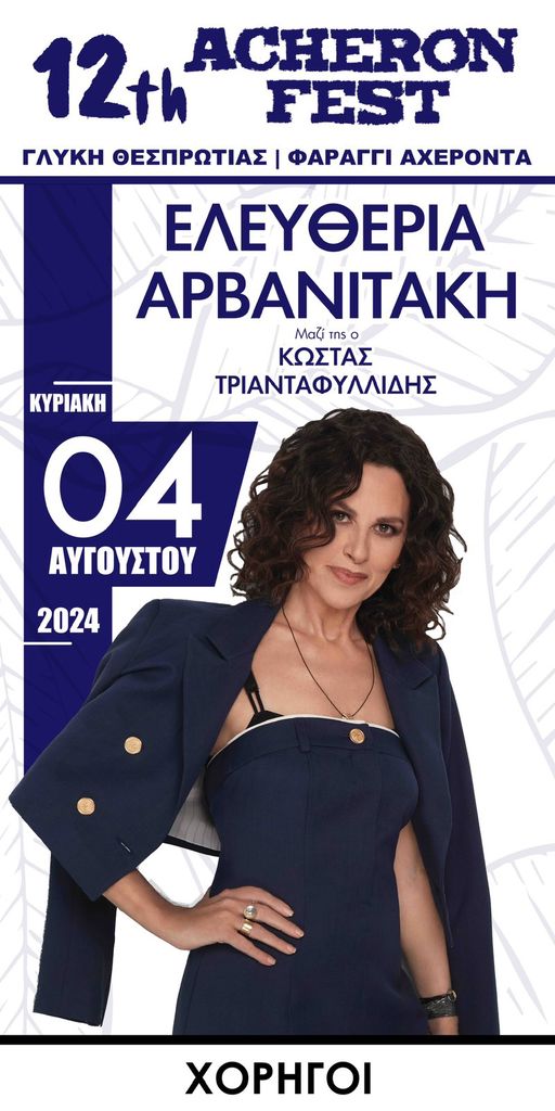 Το Acheron Fest μας έχει συνηθίσει να διοργανώνει μεγάλες συναυλίες. Φέτος στην Γλυκή θα έρθει η Ελευθερία Αρβανιτάκη στις 4 Αυγούστου. Μαζί της θα είναι οι Trio Tenoro και ο Κώστας Τριανταφυλλίδης.