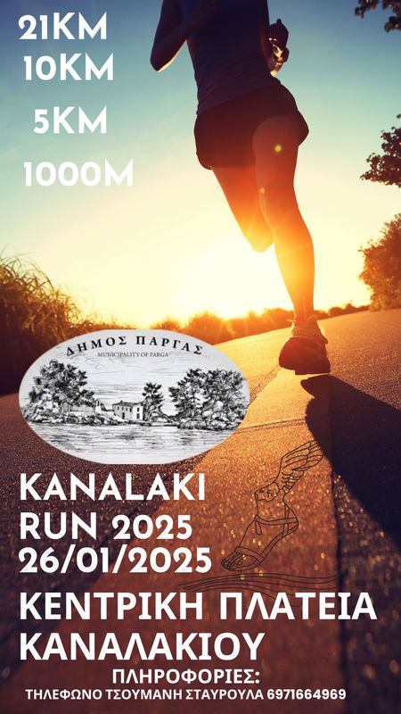 Ο Δήμος Πάργας στα πλαίσια θεσμοθέτησης αθλητικών εκδηλώσεων με κύριο στόχο την ανάπτυξη  του μαζικού λαϊκού αθλητισμού και την προβολή της περιοχής, διοργανώνει στις 26/01/2025 δρομικό event με την ονομασία  « Kanalaki Run 2025». Ο αγώνας θα έχει ως αφετηρία την Κεντρική Πλατεία Καναλακίου.