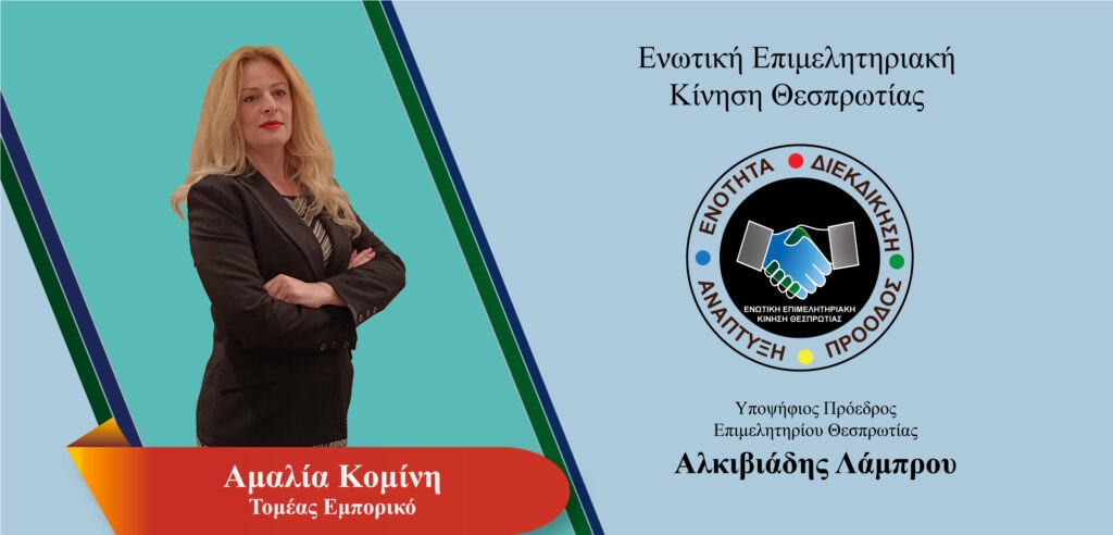 Ονομάζομαι Κομίνη Αμαλία και διατηρώ εμπορικό κατάστημα στο πεζόδρομο Γρ. Λαμπράκη 17 στην Ηγουμενίτσα. Έχω τη διάθεση και τη δύναμη να προσφέρω ως επαγγελματίας για το κοινό καλό όλων μας στο επιμελητήριο Θεσπρωτίας.